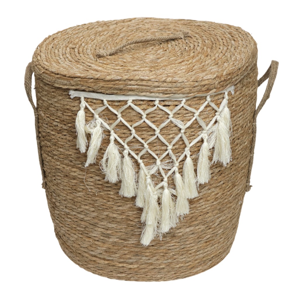 E punuar deri në detaje dhe me elementë të stilit boho, ky kosh magazinimi është zgjedhja ideale për ata që kërkojnë hapësira të organizuara dhe të pastra. Vjen në përmasat Ø42xH44 cm dhe ka kapacitetin e nevojshëm për të mbajtur të gjithë sendet tuaja të organizuara dhe të pastra. Një produkt me efikasistet të lartë dhe me një stil karakteristik që do të duket bukur me çdo stil arredimi. Vjen në material kashte dhe është shumë rezistent me kapacitet të lartë mbajtës. Ngjyra natyrale i jep një prekje estetike dhe me detaje minimaliste të cilat duken shumë këndshëm në hapësirën e tualetit, dhomës së gjumit apo edhe në çdo ambient tjetër ku ju do ta përdorni.