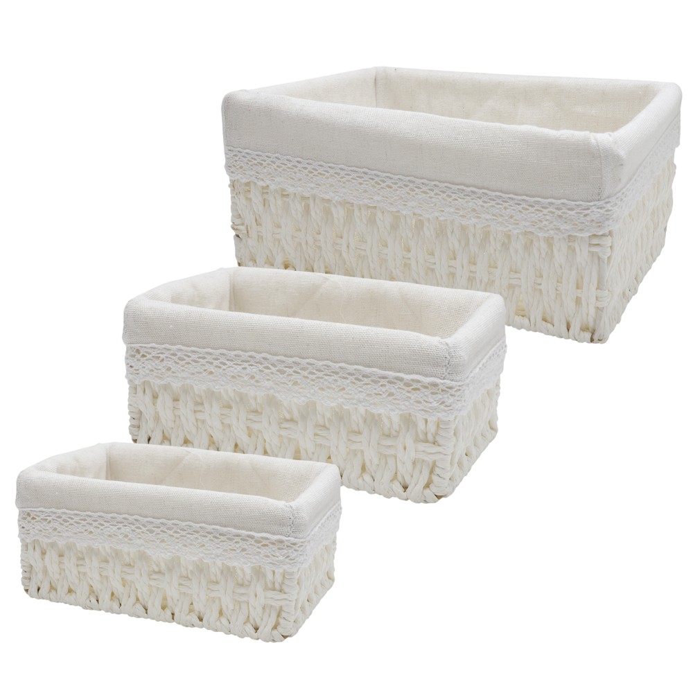 Ky set shportash magazinimi është një zgjidhje praktike dhe estetike për organizimin e hapësirave tuaja. E dizenjuar për të ruajtur dhe organizuar sende të ndryshme si rroba, lodra, aksesorë ose materiale të tjera, ajo kontribuon në ruajtjen e rendit dhe pastërtisë në ambientet tuaja. Mënyra e punimit dhe materiali i zgjedhur e bëjnë atë të jetë rezistent, që ju do të mund ta përdorni për një kohë të gjatë. Vjen në tre përmasa të ndryshme (26x20xH12 cm/22x16xH9.5 cm/18x12xH8 cm) dhe ju do të keni një hapësirë të gjerë organizuese. Mund ta përdorni si në dhomat tuaja të gjumit, po ashtu edhe në tualet për të organizuar sendet tuaja. Ky set është ideal për ata që kanë nevojë për hapësira të organizuara në shtëpitë e tyre.