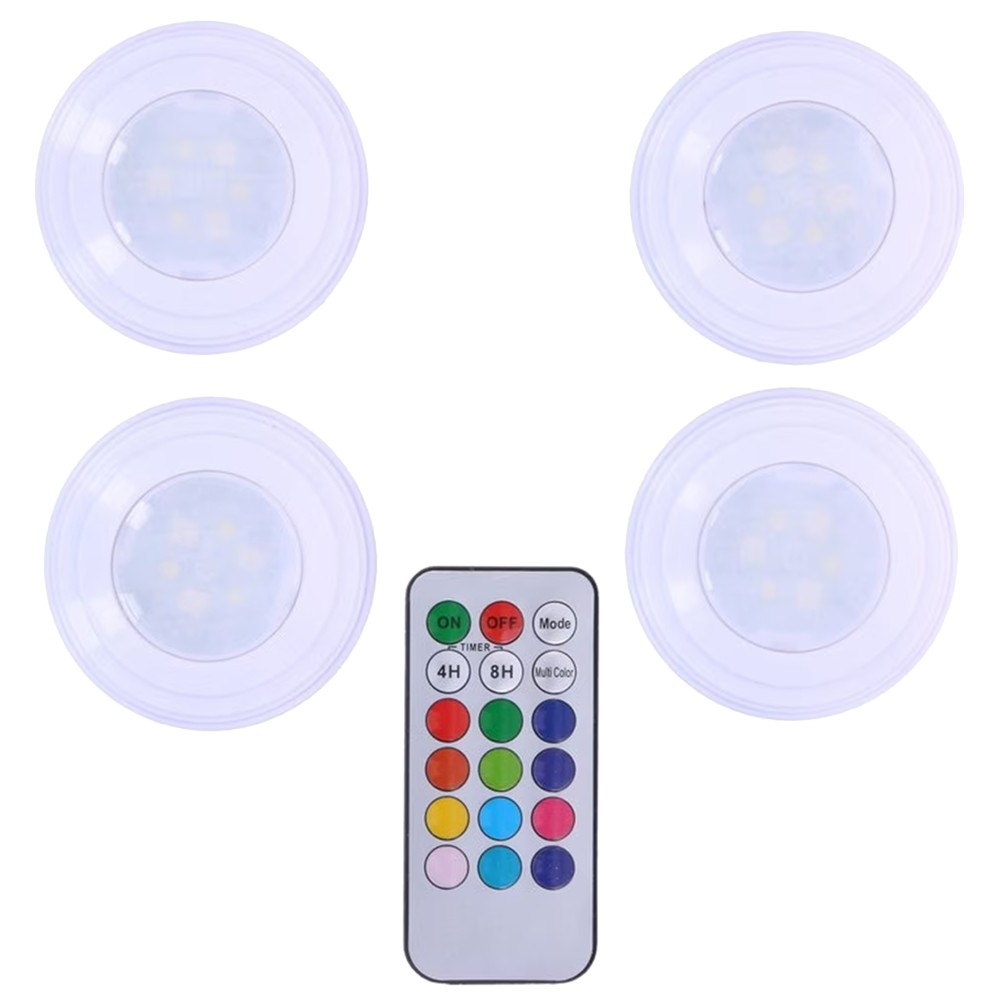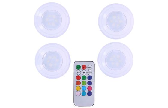 Spote LED, 4 PC, me telekomande, RGB, D.7cm, jane te pajisur me telekomande te cilat mund te komandohen lehtesisht ne ambientet ku ju do ti vendosni per tu ndricuar, Ato jane te pajisur me ngjites adeziv duke ju krijuar lehtesi ne instalimin e tyre