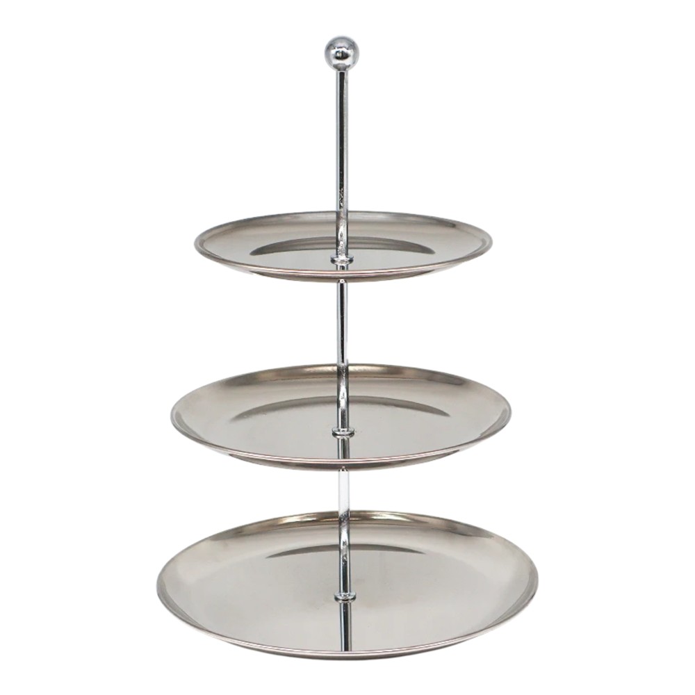 Stenda e argjendtë për servirje me 3 nivele është një tabaka elegante dhe praktike për servirje për fruta, kifle ose ëmbëlsira. Stenda është projektuar me 3 nivele me diametra të ndryshëm dhe lartësi totale 36,5 cm, e cila ofron një dizajn pompoz. Çeliku inoks ofron një kombinim të qëndrueshmërisë dhe rezistencës.