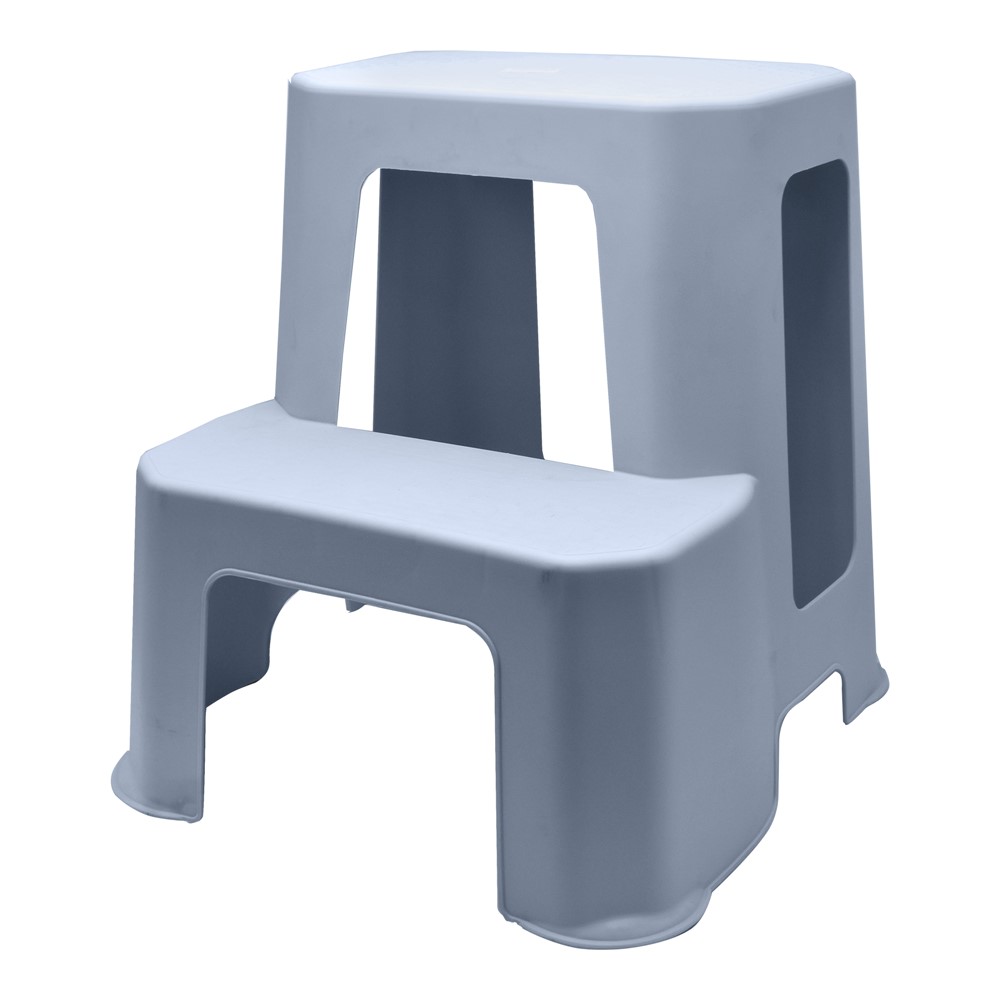 Stol me 2 shkallë për fëmijë, prej materiali plastik, në ngjyrë të kaltër, i pajisur me këmbë mbajtëse të përforcuara me bordurë, për të mbrojtur nga rrëshqitja. Përdoret për të mësuar fëmijët e vegjël të përdorin banjën e të rriturve, si dhe të arrijnë me lehtësi lavamanin për larjen e duarve ose të dhëmbëve. Ky produkt është i përshtatshëm për përdorim nga fëmijë të moshës mbi 2 vjeç.