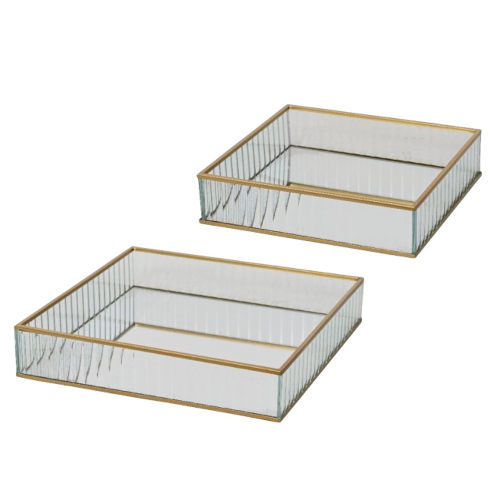 Set prej 2 tabakash dekorative metalike dhe xhami, në ngjyrë të artë, që ofron një stil elegant dhe luksoz. Përdorni këtë set si aksesor për tavolina, rafte ose si një detaj që tërheq vëmëndjen dhe krijon një atmosferë moderne dhe të rafinuar në shtëpinë tuaj.