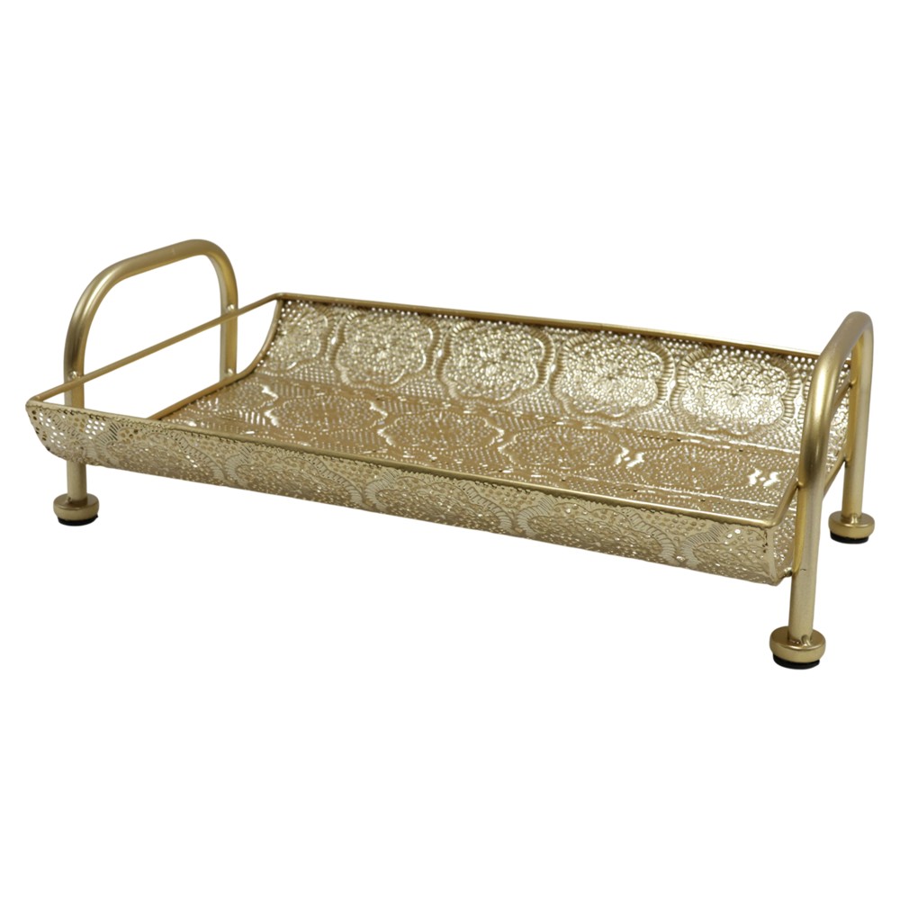 Kjo tabaka dekoruese metalike në ngjyrë floriri e cila vjen në përmasat 25xH37 cm, është një aksesor elegant dhe funksional për çdo ambient. Kombinimi i metalit me finish floriri i jep një pamje luksoze dhe moderne, duke e bërë të përshtatshme për përdorim në shtëpi, zyrë ose si pjesë e dekoreve tuaja. Kjo tabaka ka një dizajn të thjeshtë dhe të sofistikuar, e cila mund të përdoret për të shërbyer pije, si mbajtëse për bizhuteri, ose për të ekspozuar objekte dekorative si qirinj, vazo ose lule. Përmasat e saj e bëjnë të përshtatshme për tavolina, rafte ose si pjesë e një kompozimi dekorativ.