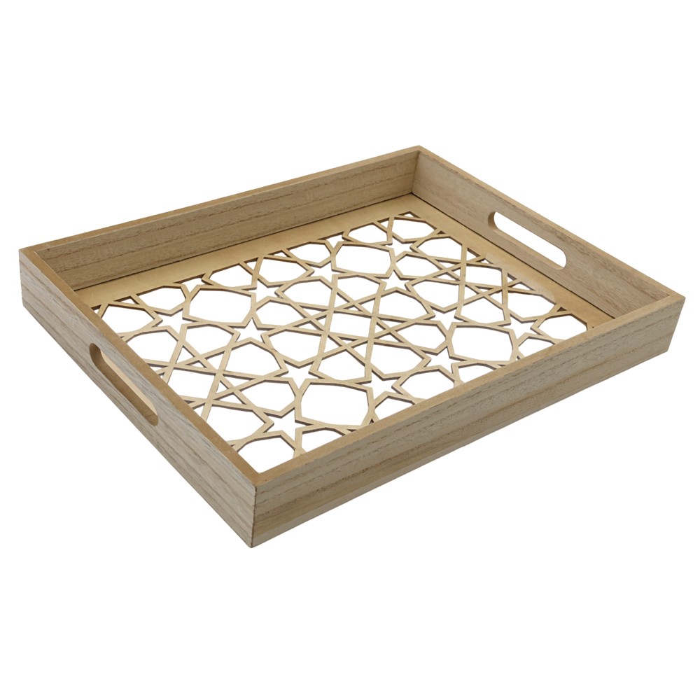 Kjo tabaka servirje është një zgjidhje praktike dhe elegante për të transportuar ushqime dhe pije, duke shtuar një prekje të ngrohtë dhe natyrale në tryezën tuaj. Ajo është mjeti ideal si për servirje në dhomën e ndenjes, ashtu edhe për organizimin e sendeve në tryezë. E punuar nga dru cilësor, kjo tabaka ka një ngjyrë të thellë kafe që thekson bukurinë natyrale të materialit. Dizajni i saj i pastër dhe minimalist i jep një pamje të rafinuar dhe të qëndrueshme. Me përmasat 30x40 cm, tabaka ofron një sipërfaqe të madhe për të vendosur pjata, gota, filxhanë ose sende të tjera. Dorezat e saj anësore e bëjnë mbajtjen dhe transportin të lehtë dhe të sigurt. Është një kombinim perfekt i funksionalitetit dhe estetikës, duke e bërë një shtesë thelbësore për çdo shtëpi.