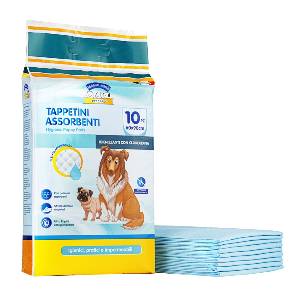 Dyshekë super absorbues me klorheksidinë. Shtresa e sipërme është e përbërë nga celulozë e cila garanton thithjen maksimale dhe një shpërndarje më të mirë të lëngut dhe polimereve që parandalojnë formimin e aromave të këqija. Shtresa e poshtme e papërshkueshme nga uji parandalon çdo derdhje. Prania e ngjitësve në qoshe garanton ngjitjen dhe fiksimin në dysheme. Ideale për të trajnuar qenushin në një hapësirë ​​specifike për nevoja, për të mbajtur kafshën tuaj në makinë, nën tas, si bazë për lukuni dhe transportues kafshësh.