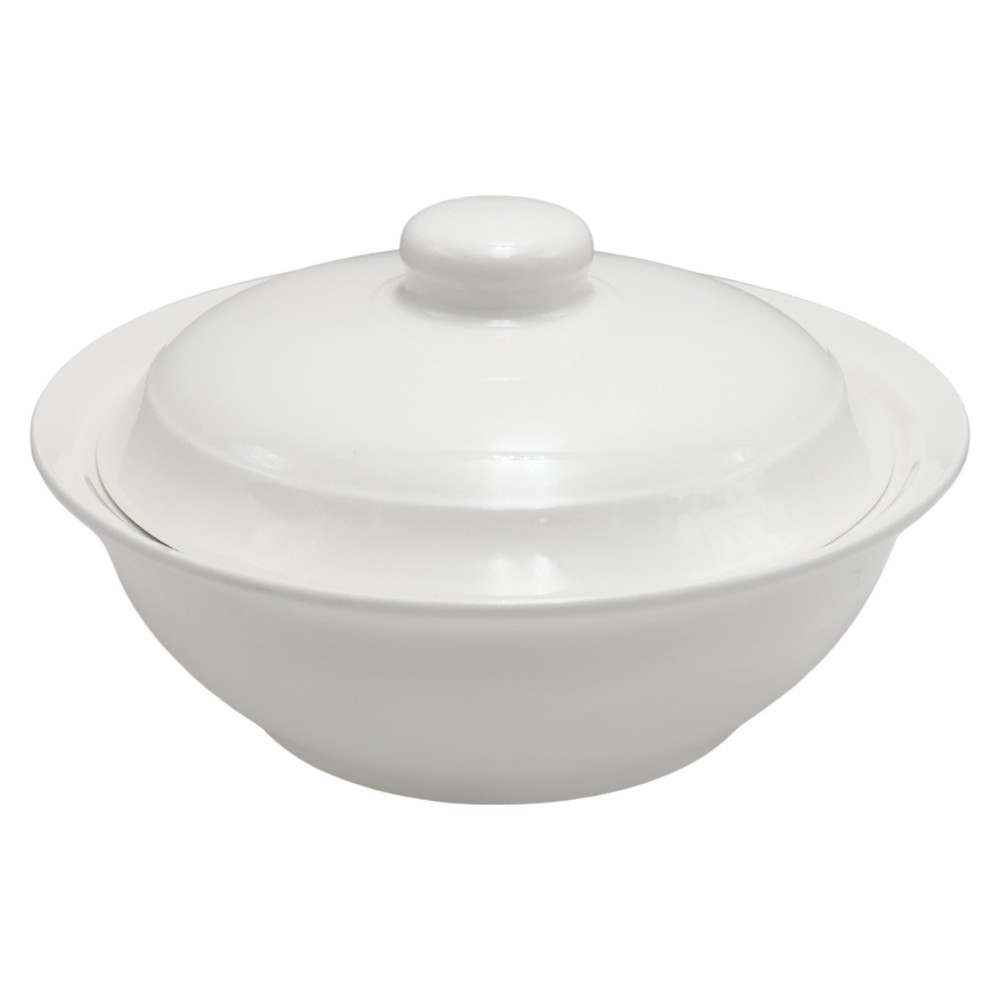 Tasi me kapak, i prodhuar nga qeramika dhe në ngjyrën e bardhë, ka një diametër prej 23 cm dhe një lartësi prej 8 cm. Ky tas me kapak është i përshtatshëm për të shërbyer pjata të ndryshme të pjekura, supa, ose gatimet e tjera që kërkojnë një kapak për të ruajtur temperaturën dhe aromën. Kapaku i bashkëngjitur siguron që ushqimi të mbetet i freskët dhe i ngrohtë për një kohë më të gjatë. Ngjyra e bardhë dhe dizajni i thjeshtë e bëjnë të përshtatshme për shumë stile të dekorit, ndërsa materialet e qeramikës e bëjnë të qëndrueshme dhe të përshtatshme për përdorim të përditshëm në kuzhinë.