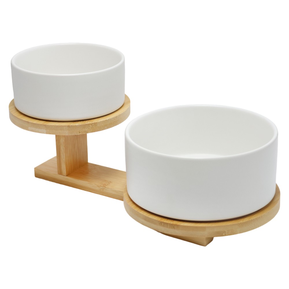 Set prej dy tasash me kapak, të realizuara nga qeramika dhe bambu, në ngjyrat e bardhë dhe kafe. Ofron një zgjedhje elegante për servirjen e ëmbëlsirave, ose ushqimeve të tjera të shërbyera me ngrohtësi.