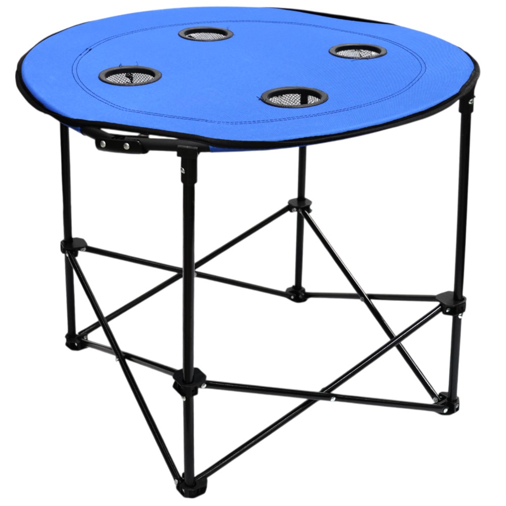 Tavolinë kampingu portative, në formë rrethore, me një strukturë mbajtëse të qëndrueshme, prej materiali metalik. Sipërfaqja e tavolinës është e përbërë nga material 100% poliestër, e pajisur me 4 vende për të vendosur gotat. Përdoret në kamping, piknik apo në plazh dhe mund të transportohet lehtësisht falë përmasave kompakte.