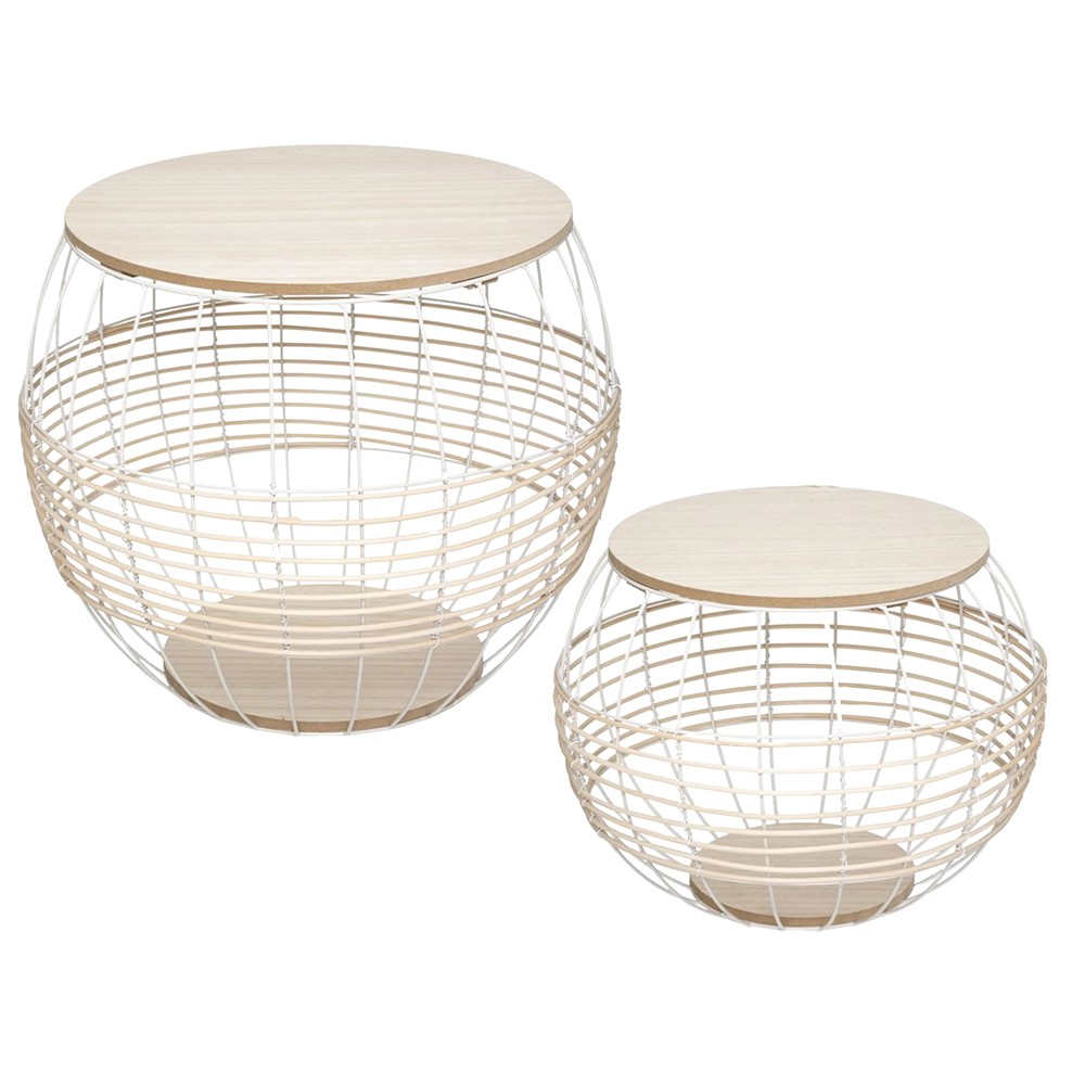Tavolinë këndi, set 2 copë, Juline, strukturë metalike, syprinë druri, e bardhë/bezhë, Ø41 xH31 cm; Ø50 xH41.5 cm