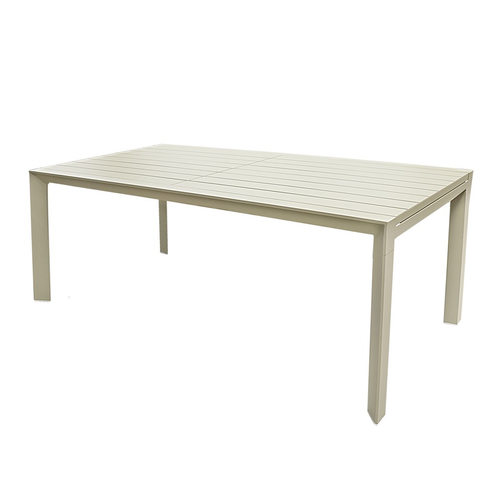 Ndertuar nga Alumin solid dhe lyer me procesin "elektrostatik" te aplikimit te bojes. Me peshe te lehte. Mbreslenese fale permases praktike. Tavolina me zgjatim ofron hapesire te mjaftueshme per vizitat spontane apo festimet e medha familjare dhe behet qendra e aktivitetit. Madhesia baze prej 200x98.5xH76 cm ofron hapesire per 8 persona. Pjesa e siperme e tavolines mund te zgjerohet lehtesisht me ane te mekanizmit zgjatues, duke e bere kete tavoline me gjatesi totale prej 300 cm, e cila mund te ofroje hapesire per akomodim deri ne 12 persona.