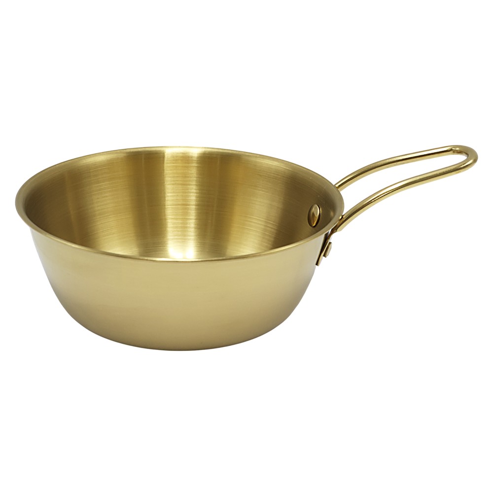 Tigani konik me përmasa 6x20.5 cm, i punuar nga material metalike me përfundim ngjyrë floriri, është një aksesor elegant dhe funksional për çdo kuzhinë. Forma e tij konike lejon shpërndarje të njëtrajtshme të nxehtësisë, duke e bërë ideal për shkrirje, salca, karamelizime apo përgatitje precize në porcione të vogla. Materiali metalik siguron qëndrueshmëri dhe jetëgjatësi, ndërsa ngjyra e artë i shton një pamje luksoze që e veçon në çdo ambient gatimi. Një mjet praktik dhe estetik, i përshtatshëm si për përdorim shtëpiak ashtu edhe profesional.