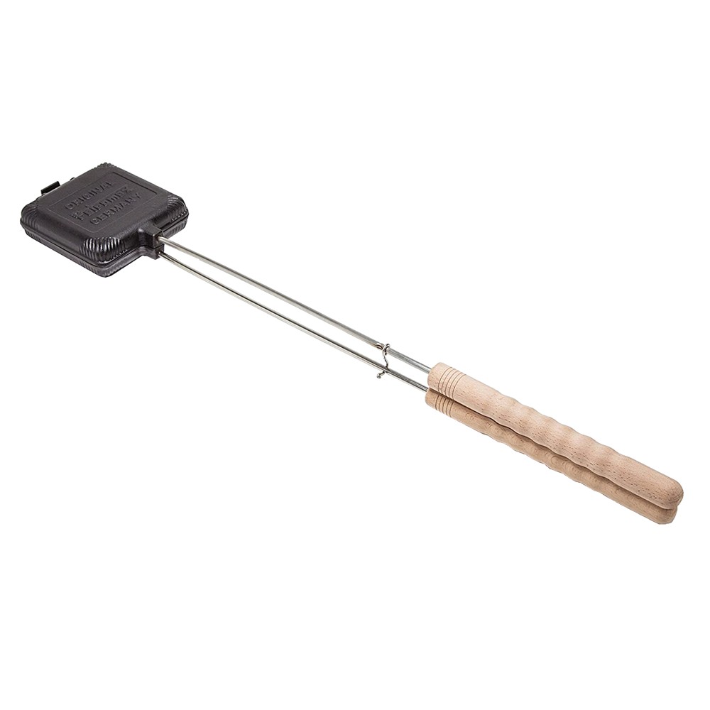 Tave tigan per sanduice, prej materiali gize e cila mban dhe shpernda nxehtesine ne te gjithe siperfaqen. Eshte e pershtatshme për bukë të thekur, bagels ose petë. Qoftë në zjarr kampi apo në skarë, tosti piqet si krokant dhe mbushja, e shijshme apo e ëmbël, është e shijshme me lëng. Format prej gize janë ideale për feta tosti me diameter 12 cm dhe janë menjëherë gati për përdorim falë sipërfaqes së para-trajtuar (finimi me erëza).Grepa praktike e kyçjes i mban enët e bukës së bukës në mënyrë që asgjë të mos bjerë jashtë.Rekomandime: • Mos derdhni lëngje të ftohta (si uji) mbi pjesët prej gize të tiganit të nxehtë, sepse giza mund të plasaritet ose të dëmtohet ndryshe.