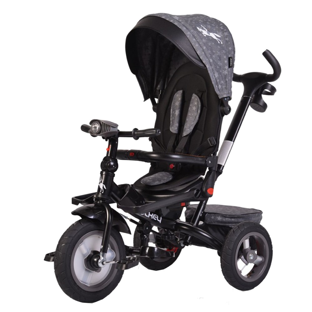 Triçikël për fëmijë, me strukturë prej materiali çeliku dhe plastike dhe me veshje prej materiali poliestre, në ngjyrë gri dhe të zezë, me mbushje sfungjeri me veti antialergjike dhe antibakteriale. Triçikli është i pajisur me një mbështetëse të lëvizshme, me strehë, me dorezë teleskopike me veshje gome, një dritë me muzikë, një mbajtëse për të vendosur lodrat në pjesën e pasme dhe me dy pedale në rrotën e parme. Ky produkt ka kapacitet mbajtës deri në 30 kg dhe është i përshtatshëm për përdorim nga fëmijë të moshës 12 deri në 48 muajsh.