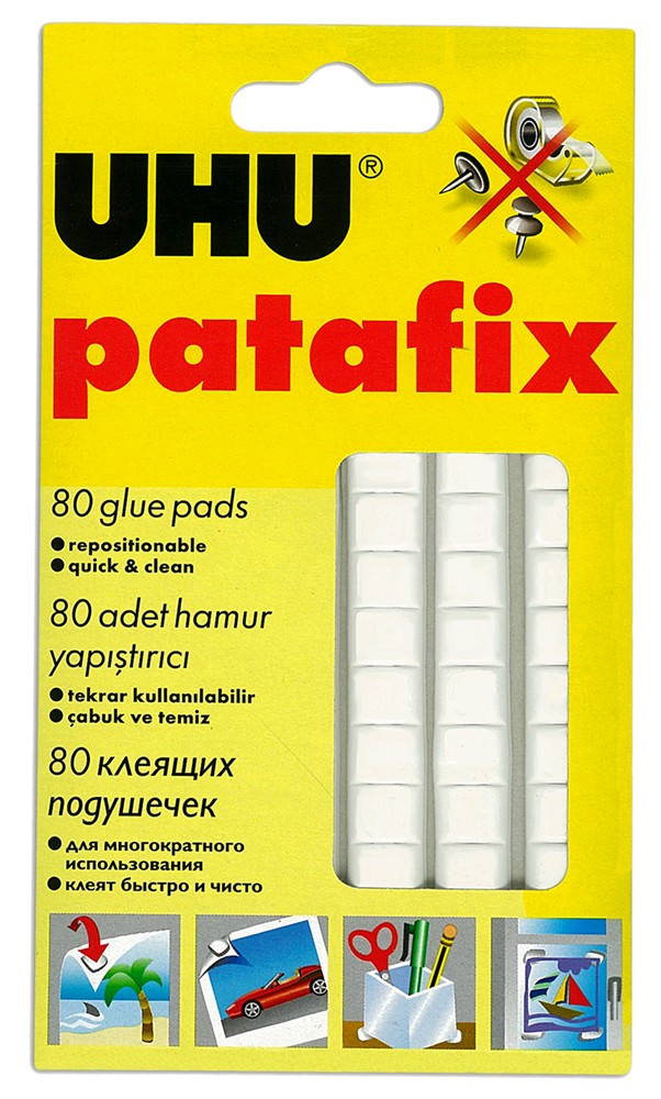 UHU patafix është i ripozicionueshme, ngjitës për lidhje të shpejtë dhe të pastër, për të bashkëngjitur objekte të vogla në çdo sipërfaqe të tilla si: mure, mobilje, dritare etj.