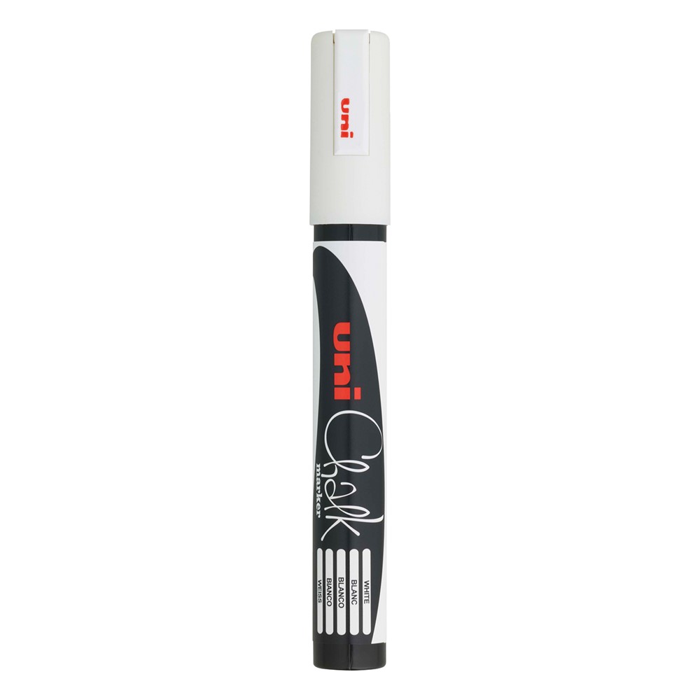 Shkumës I bardhë I lëngshëm Uni Marker. Shkruan në çdo sipërfaqe jo poroze (tabela e zezë, qelqi, plastika, metali, druri, etj.) Eshtë rezistent ndaj lagështirës dhe mund të pastrohet lehtë me një letër të lagur.