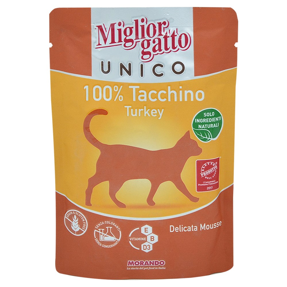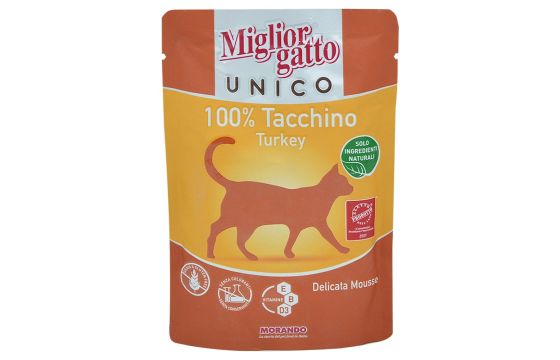 Migliorgatto Unico është një ushqim i plotë i përshtatshëm për të ushqyerit e përditshëm të të gjitha macet, të fituara me përbërës natyralë. Karakteristikat e tij kryesore duhet të jenë 100% e një burimi të vetëm proteina dhe të jenë të lirë nga drithërat. Kjo recete e bën atë produkt ideal për ata që duan të ruajnë mace e tyre nga efektet e ndonjë intolerance të ushqimit në mish që është ndryshe nga proshutat. Migliorgatto është unik për llojin e proteinës së përdorur, unike për shijen e saj, unike për freskinë dhe ushqimin që garanton.
