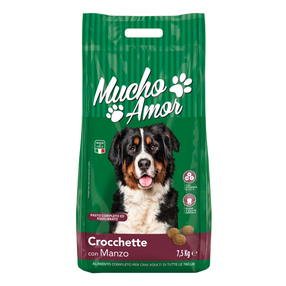 Një formulë me përbërës të cilësisë së lartë, me proteina shtazore dhe drithëra për të siguruar që çdo vakt të sigurojë të gjitha lëndët ushqyese thelbësore që i nevojiten qenit tuaj për të qëndruar i shëndetshëm dhe në formë. Kibbles Mucho Amor janë të pasura me vitamina A, D3, E, natyrisht pa ngjyrues dhe sheqerna të shtuar. Ushqim i plotë për qentë të të gjitha madhësive i përbërë nga: drithëra, mish dhe derivate (mish viçi 4%), nënprodukte me origjinë bimore, vajra dhe yndyrna, fara, lëndë minerale. Kroketat mund të administrohen direkt në tas, ose me shtimin e një sasie të vogël uji mundësisht të vakët ose lëng mishi. Rekomandohet administrimi i dozës së rekomanduar ditore, duke e ndarë atë në të paktën 2 vakte.