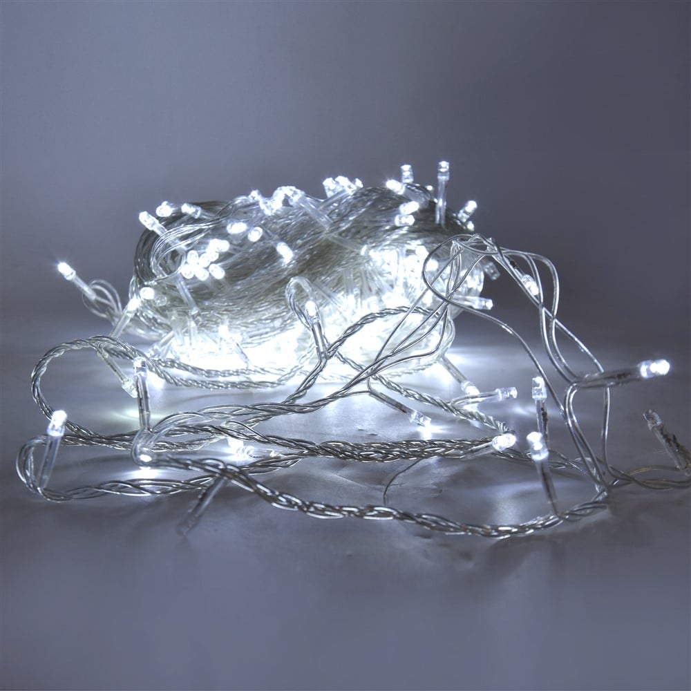 Po vlerësoni:Varg dritash LED, 20m, 200 led, me 20% flesh, me kabell transparent,white, me bashkim per ambient te jashtem, IP44