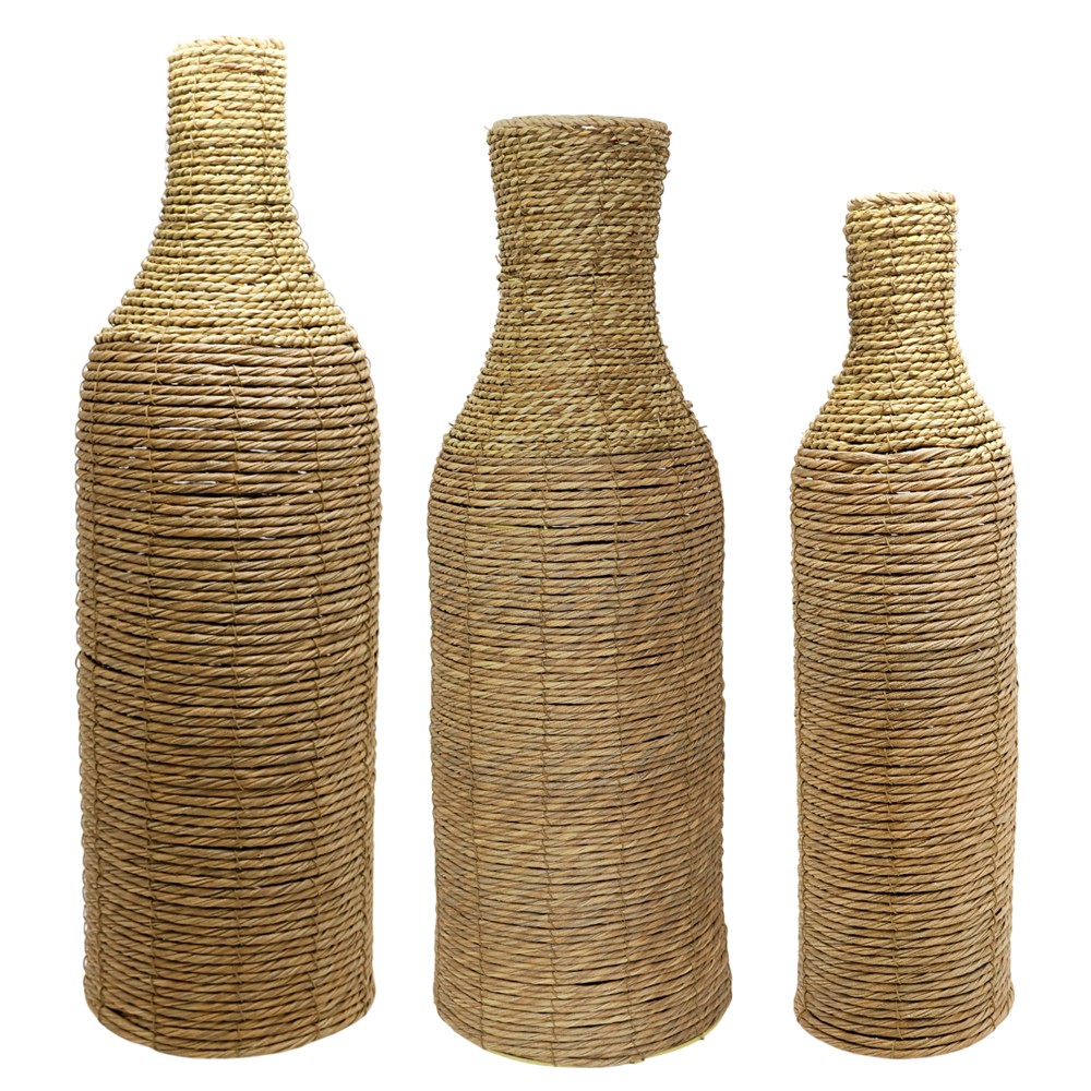 Seti i vazove dekorative prej kashte në ngjyrë natyrale, me përmasa 17xH60 cm, 21xH70 cm dhe 27xH80 cm, ofron një kombinim elegant të formave dhe lartësive që pasuron çdo ambient me ngrohtësi dhe stil natyral. Të punuara nga kashtë me teksturë të butë dhe pamje autentike, këto vazo sjellin një ndjesi organike dhe relaksuese, duke u përshtatur në mënyrë të përkryer me arredime rustike, boho apo skandinave. Falë formës së tyre të lartë dhe të ngushtë, janë ideale për vendosjen në dysheme, në qoshe dhomash, pranë mobilieve apo në hyrje, ku mund të mbajnë degë dekorative, lule të thata apo bimë artificiale me gjatësi të madhe. Kombinimi i tre madhësive krijon një efekt vizual dinamik dhe të balancuar, duke e kthyer setin në një pikë fokale elegante brenda hapësirës.