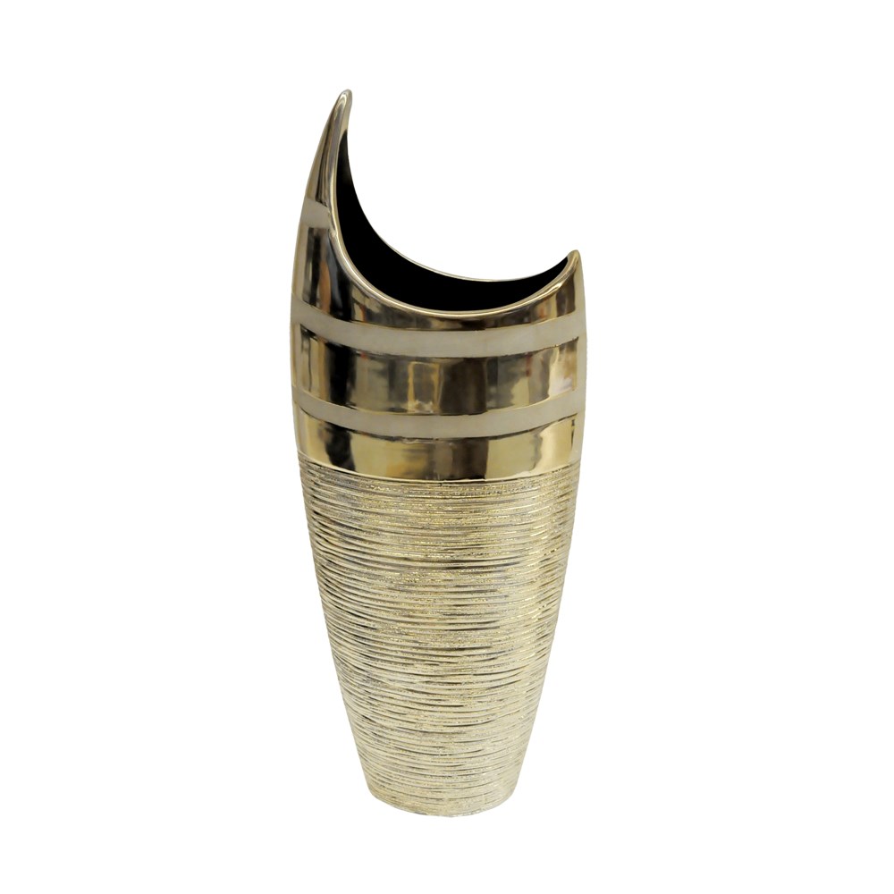 Vazoja dekorative qeramike punim dore me stil të thjeshtë dhe unik transformon pamjen e dhomës tuaj . Qoftë bosh ose e mbushur me lule apo aksesorë te tjerë. Kjo vazo tërheqëse do të krijojë një vështrim të përjetshëm që është thjesht magjepsës. Shto një ose disa vazo në dekorin e shtëpis tuaj sot.