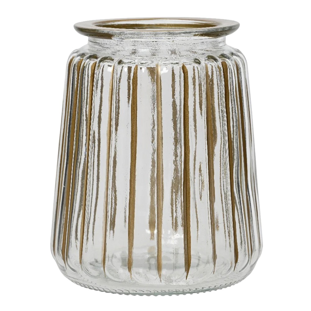 Shtoni një prekje rafinimi në dekorin tuaj me këtë vazo dekoruese prej xhami. E punuar me mjeshtëri, xhami i saj transparent kombinon bukurinë natyrale me detajet në floriri, duke krijuar një efekt të sofistikuar dhe luksoz. Me dimensionet Dia.12 x H14.5 cm, kjo vazo është perfekte për të shfaqur lule të freskëta ose artificiale, qirira dekorative ose thjesht si një aksesor elegant në tavolinën tuaj të ditës ose në raft. Reflekton dritën në mënyrë delikate, duke shtuar një ndjenjë ngrohtësie dhe stilit në çdo hapësirë.