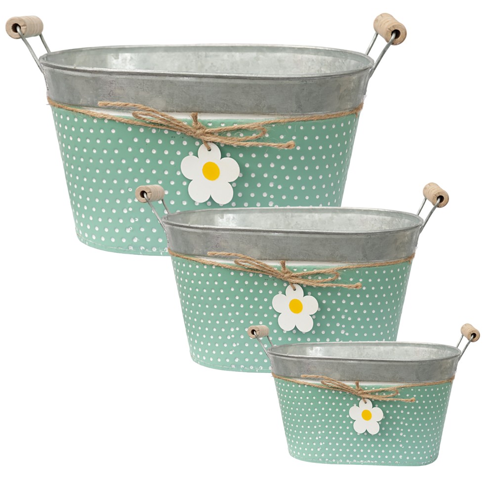 Vazo lulesh, set 3 copë, metalike, gri/jeshile, 22x14x13 cm; 25x16x14 cm; 28.5x18x15 cm
