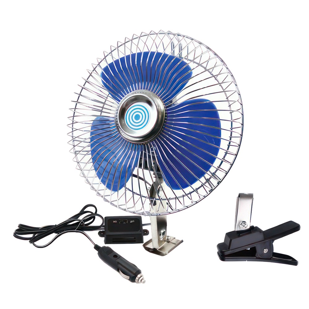 Ventilator i madh metalik AMiO i mundësuar nëpërmjet folesë ndezëse të cigares12V. Montimi realizohet me kapëse ose vida. Funksionet: rregullimi i këndit të animit 2 lloje të furnizimit me ajër