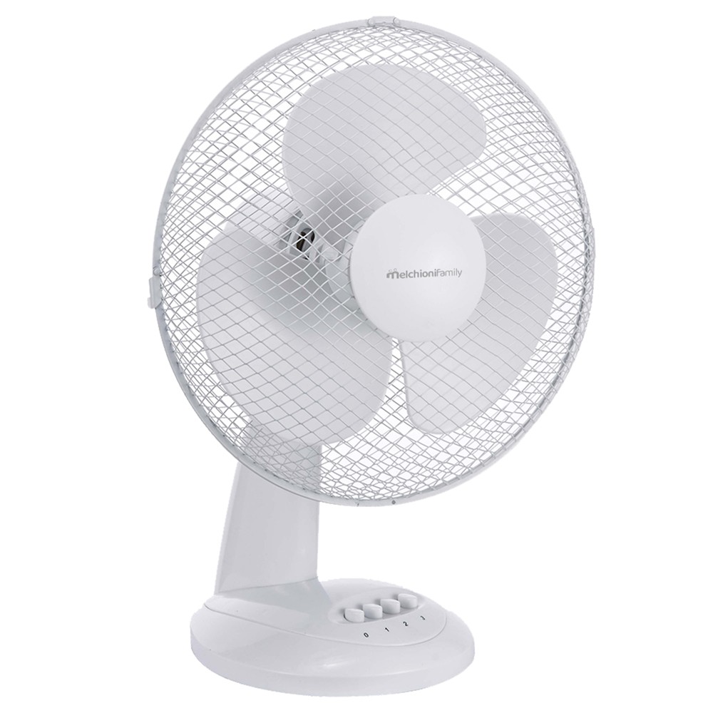 Ventilator tavoline Melchioni, me 3 fletë Ø30 cm. Ka 3 shpejtësi dhe funksion lëkundjeje. Fuqia: 40 W, furnizimi me energji elektrike: 220-240V ~ 50Hz